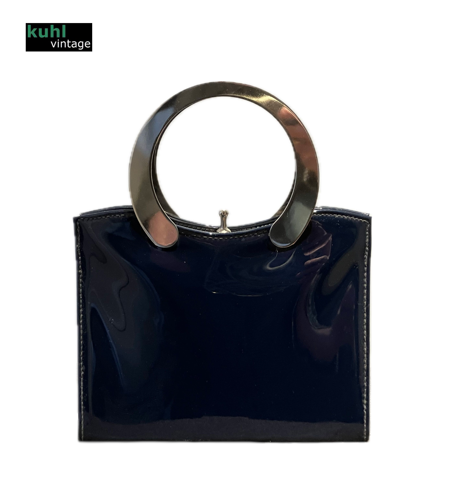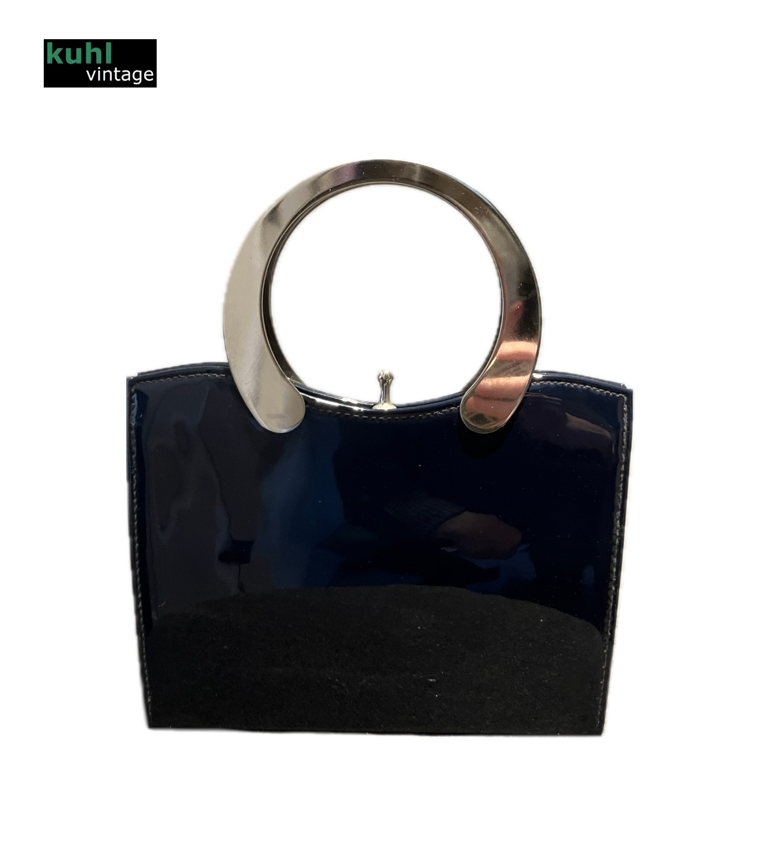 1960’s Essell Navy Patent Handbag. Polished steel circular handle.