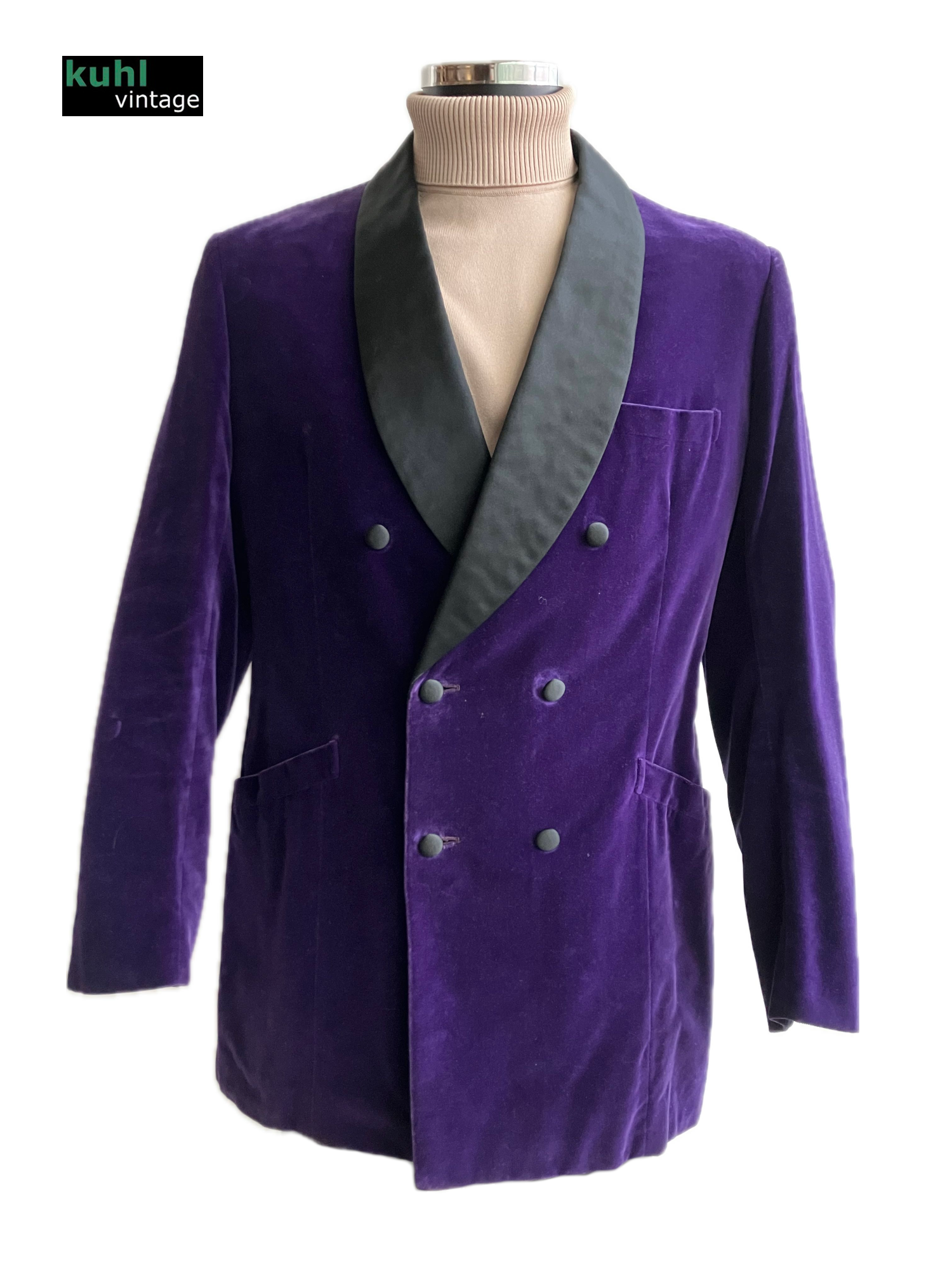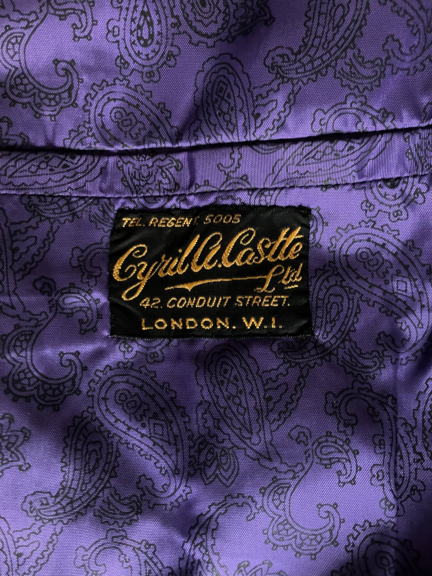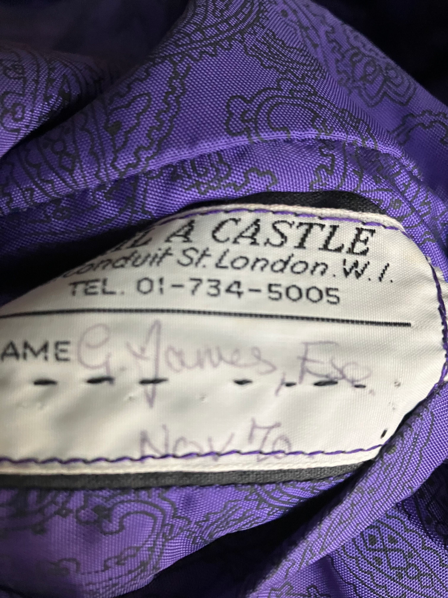 Fabulous quality item, dated February 1970. Original buttons. Two side pockets. Chest pocket. Purple paisley print lining. Double vent.